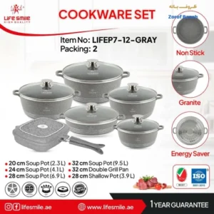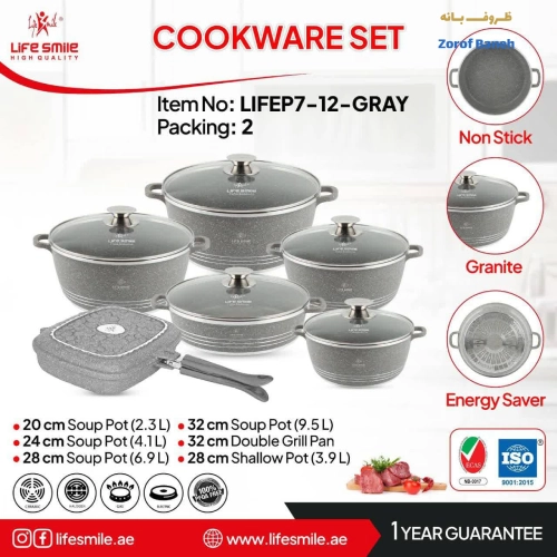 سرویس قابلمه 12 پارچه لایف اسمایل مدل LIFEP7 یکی دیگر از محصولات با کیفیت و زیبای برند معتبر LIFE SMILE میباشد. این سرویس از چهار عدد قابلمه دربدار در سایزهای 20، 24، 28 و 32 سانتیمتر، یک عدد تابه دربدار در سایز 28 سانتیمتر و یک عدد تابه دستهدار دو طرفه با سایز 32 سانتیمتر تشکیل شده است. ساختار بدنه سرویس از آلومینیوم ریختهگری شده با روکش گرانیتی بوده و دارای پایه القایی میباشد. ساخت این محصول با آلومینیوم موجب انتقال بهتر و توزیع یکنواخت حرارت در هنگام پخت غذا میشود. سرویس قابلمه لایف اسمایل هیچگونه گاز مضر PFOA را تولید نخواهد کرد و همچنین دارای سطوح نچسب بوده که غذا به آن نخواهد چسبید. جنس درب سرویس LIFE SMILE LIFEP7 از شیشه بوده که بر روی آن منافذ بخار تعبیه گردیده است. این سرویس قابلیت استفاده بر روی انواع اجاق گاز را دارد و همچنین میتوانید آن را در داخل فر نیز قرار دهید.